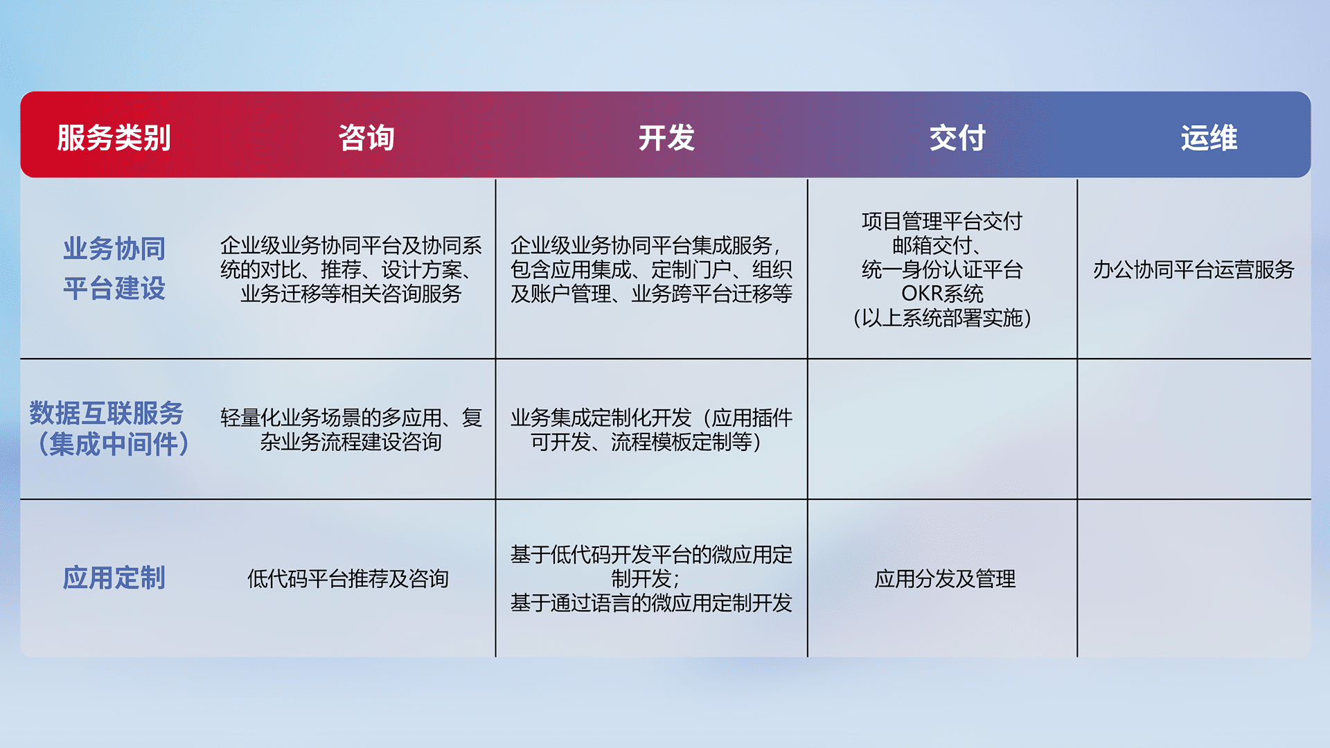 针对钉钉、、企微、、、IDaas等平台级产品提供产品的规划、、方案、、交付、、、、定制化开发等服务,,,实现如统一协同办公、、、智能客户服务、、、混合会议管理、、智能数据查询、、、等业务场景,,,实现数字化转型。。