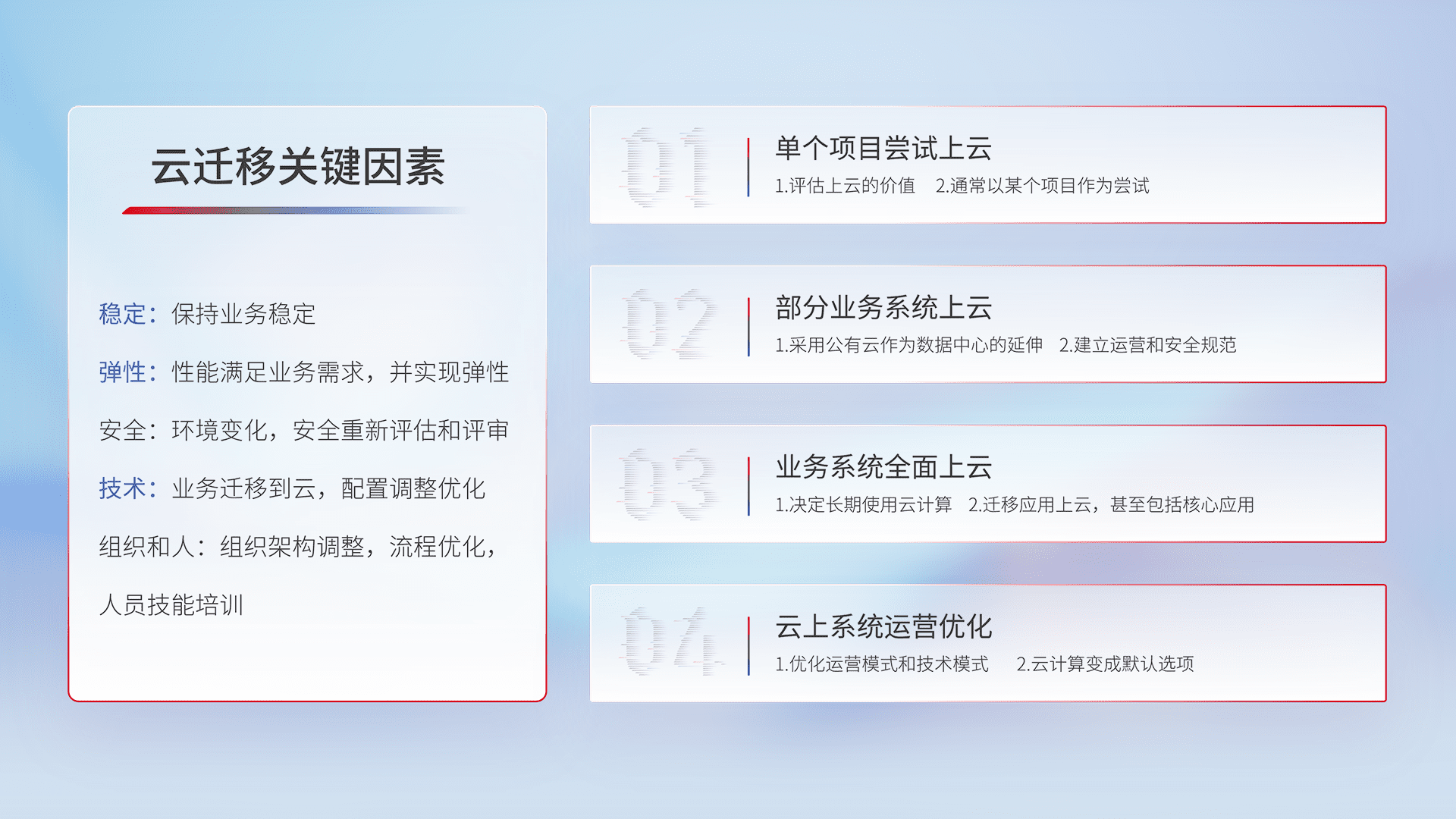 结合实际业务,,,从规划设计、、、云平台选型、、云原生改造、、、数据迁移、、、集成交付,,迁移全过程为客户识别最佳上云路径,,做好风险识别管理,,,设计网络架构、、身份权限、、、安全审计合规、、、操作审计、、、日志审计、、监控告警策略、、、多站点容灾设计等,,,对云上基础设施进行整体规划,,,提升IT治理水平,,,以满足弹性、、、、高可用、、、高性能的需求。。。