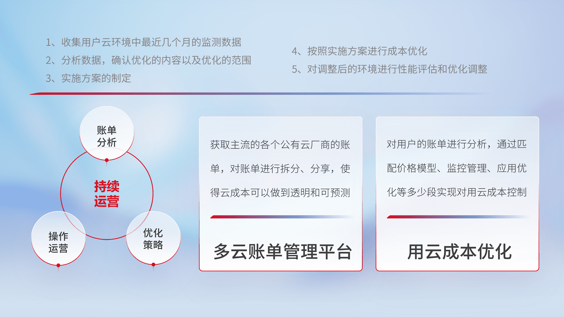 通过多云纳管,,以统一的资源数据模型把客户的云资源进行抽象和封装,,,进而实现对多云资源的统一操作,,,,保障云资源管理的可靠性、、、稳定性与可用性。。。。量身定制化运维内容,,,,配置、、、、开发运维、、、、补丁管理、、、、备份、、、监控、、、、认证和访问管理、、、审计和日常巡检等,,,,保障在用云过程中的可靠度,,稳定度以及高可用率。。。。